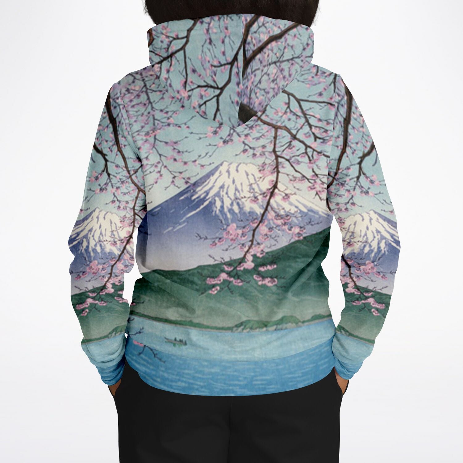 "Nishiizu" by Kawase Hasui is a refreshing scene featuring Mount Fuji seen across Suruga Bay amid cherry blossoms in full bloom. It's famous as one of Steve Jobs' first acquisitions of Hasui's work. Wearing this design on a hoodie brings a serene touch of nature and cultural significance to your outfit.