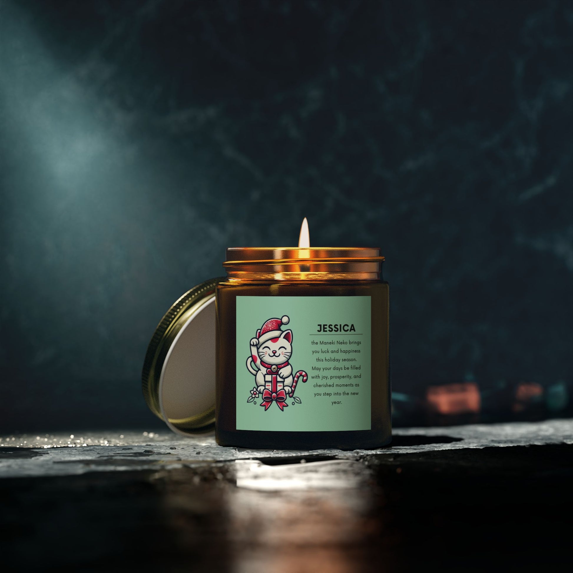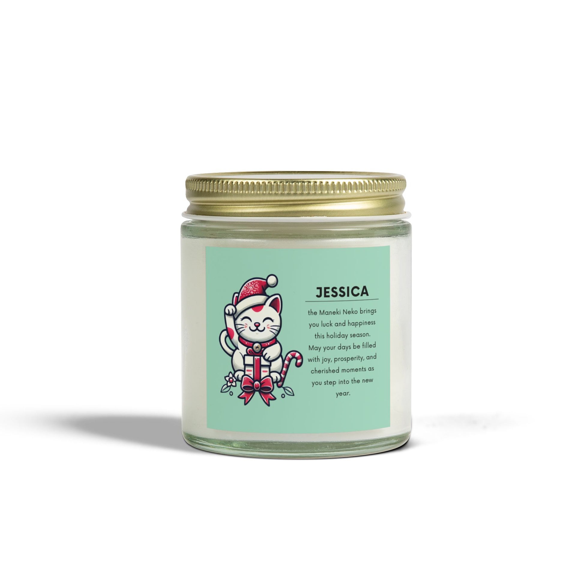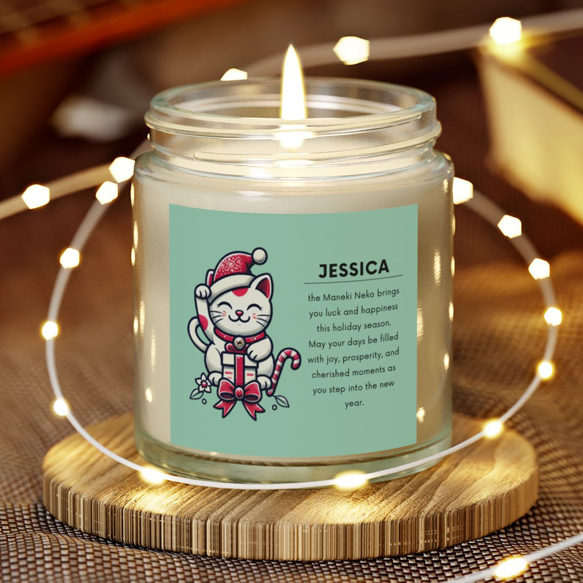 Spread joy and prosperity this holiday season with the Maneki Neko Holiday Candle. Featuring the iconic Japanese lucky cat dressed as Santa, this candle symbolizes good fortune, happiness, and new beginnings. Personalize it with any name for an extra-special touch, making it a thoughtful gift for friends and loved ones.