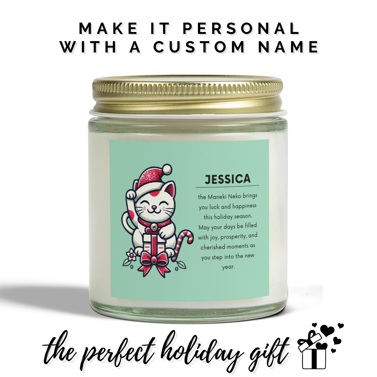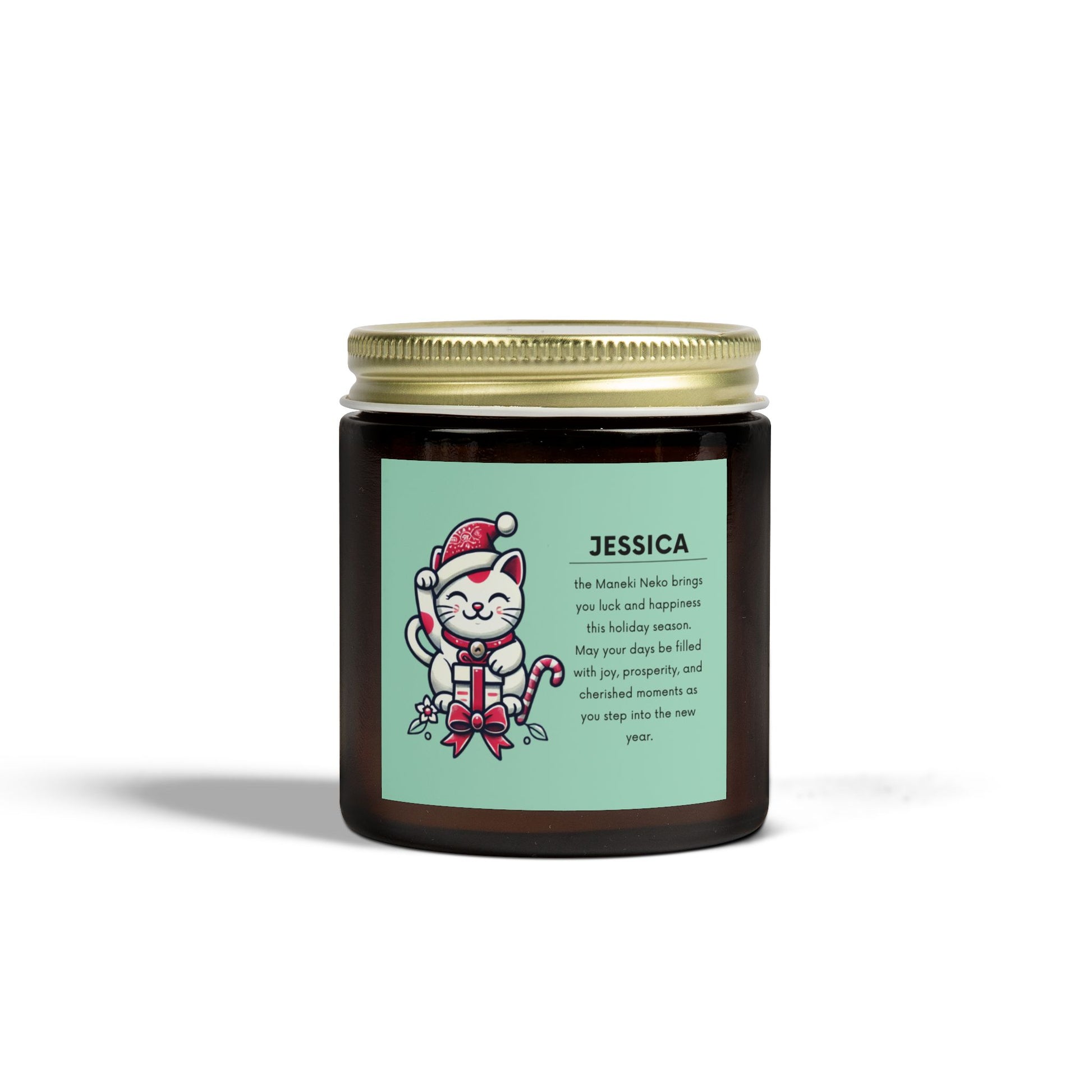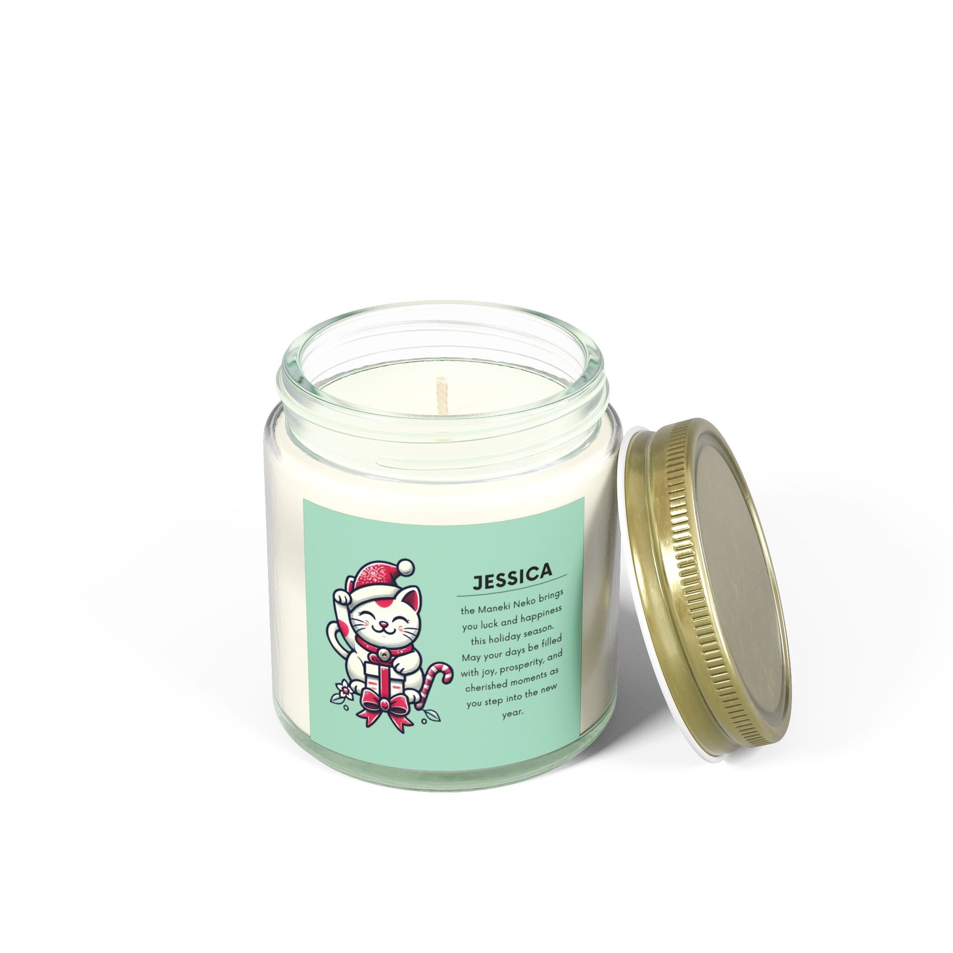 Spread joy and prosperity this holiday season with the Maneki Neko Holiday Candle. Featuring the iconic Japanese lucky cat dressed as Santa, this candle symbolizes good fortune, happiness, and new beginnings. Personalize it with any name for an extra-special touch, making it a thoughtful gift for friends and loved ones.