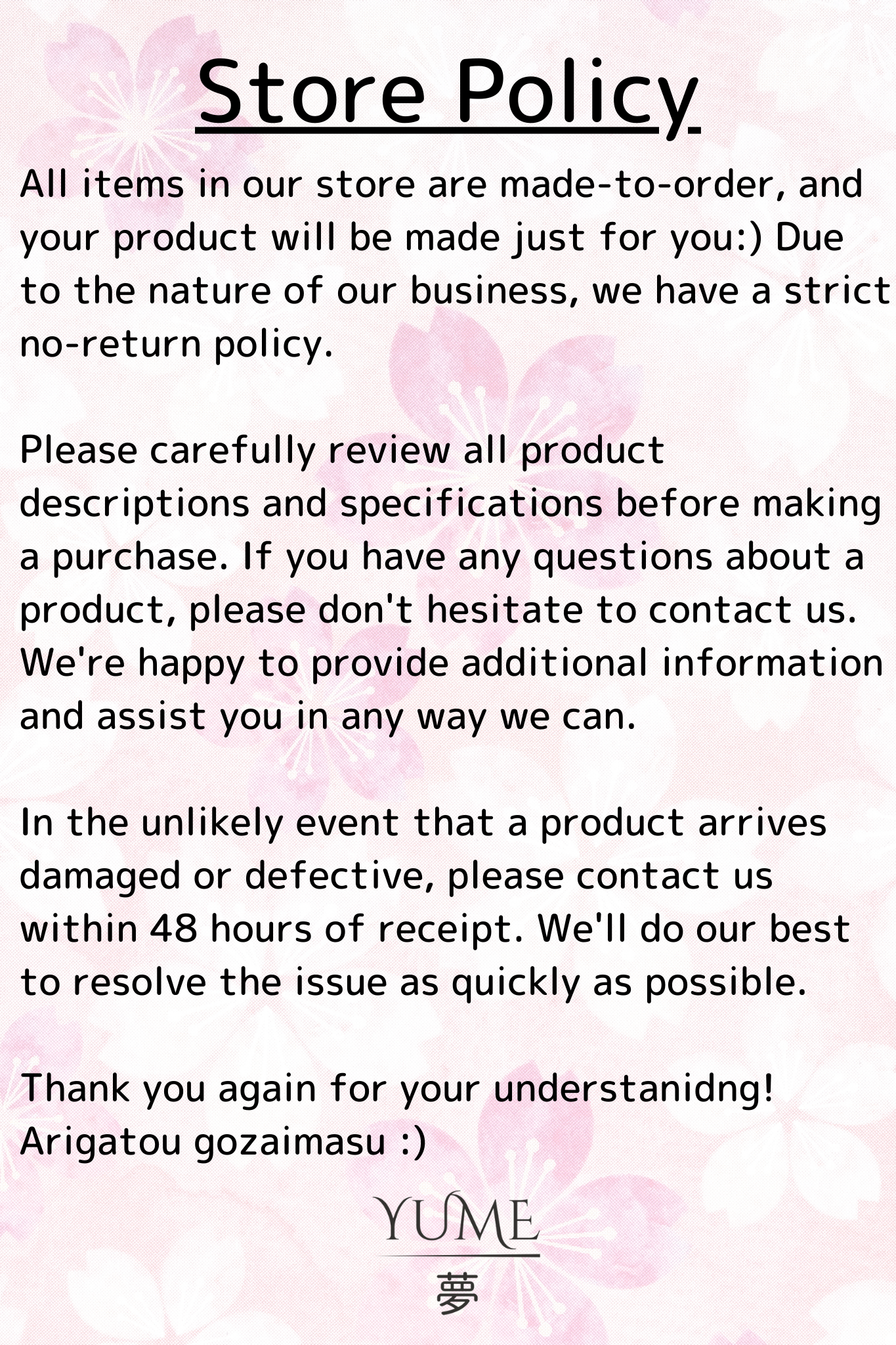 We're grateful for your understanding that, as everything is made-to-order, we are unable to accept returns or exchanges. Rest assured, your product is crafted exclusively for you! Nevertheless, we stand by our commitment to quality. Should you encounter any defects with your item(s), please don't hesitate to reach out to us.