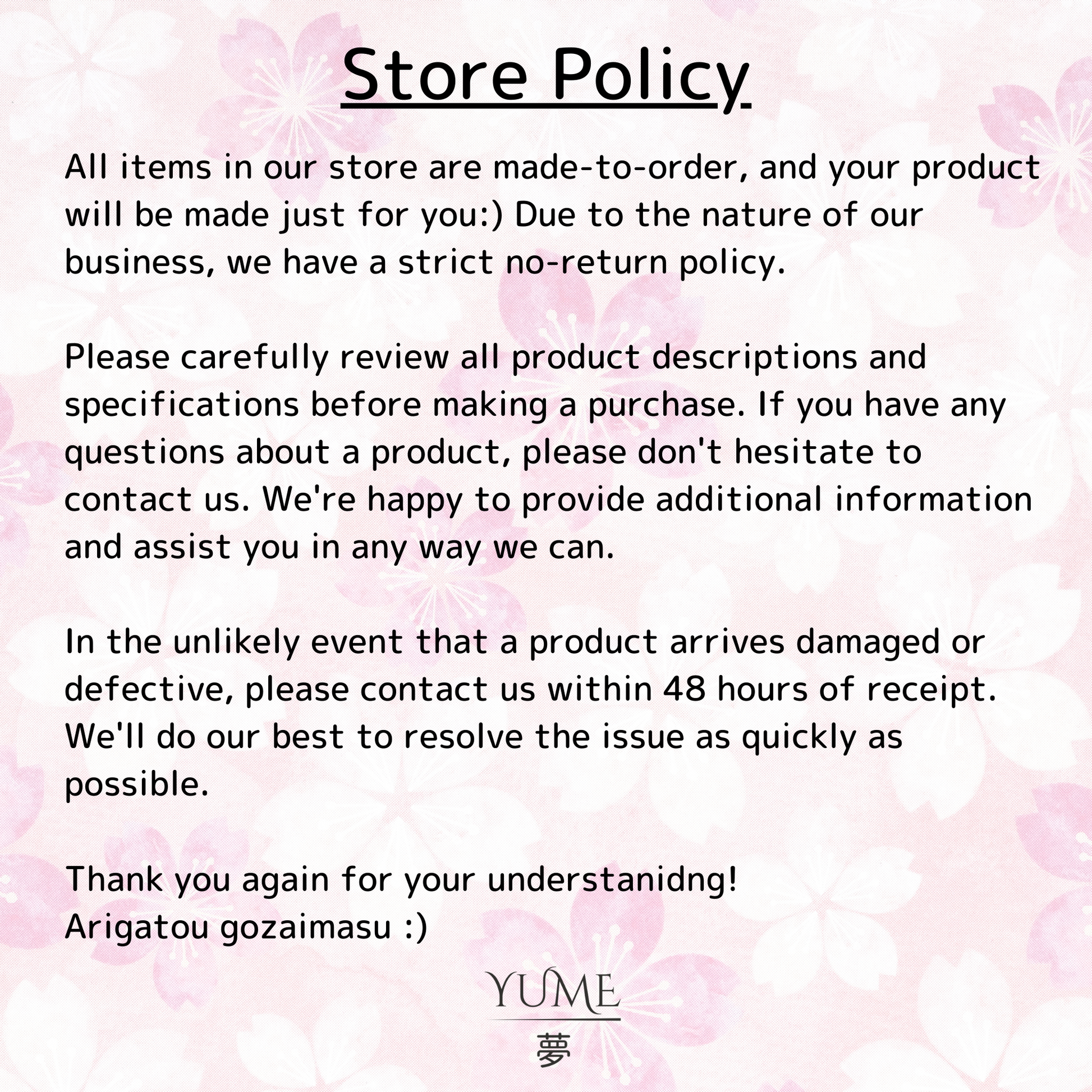 We're grateful for your understanding that, as everything is made-to-order, we are unable to accept returns or exchanges. Rest assured, your product is crafted exclusively for you! Nevertheless, we stand by our commitment to quality. Should you encounter any defects with your item(s), please don't hesitate to reach out to us.